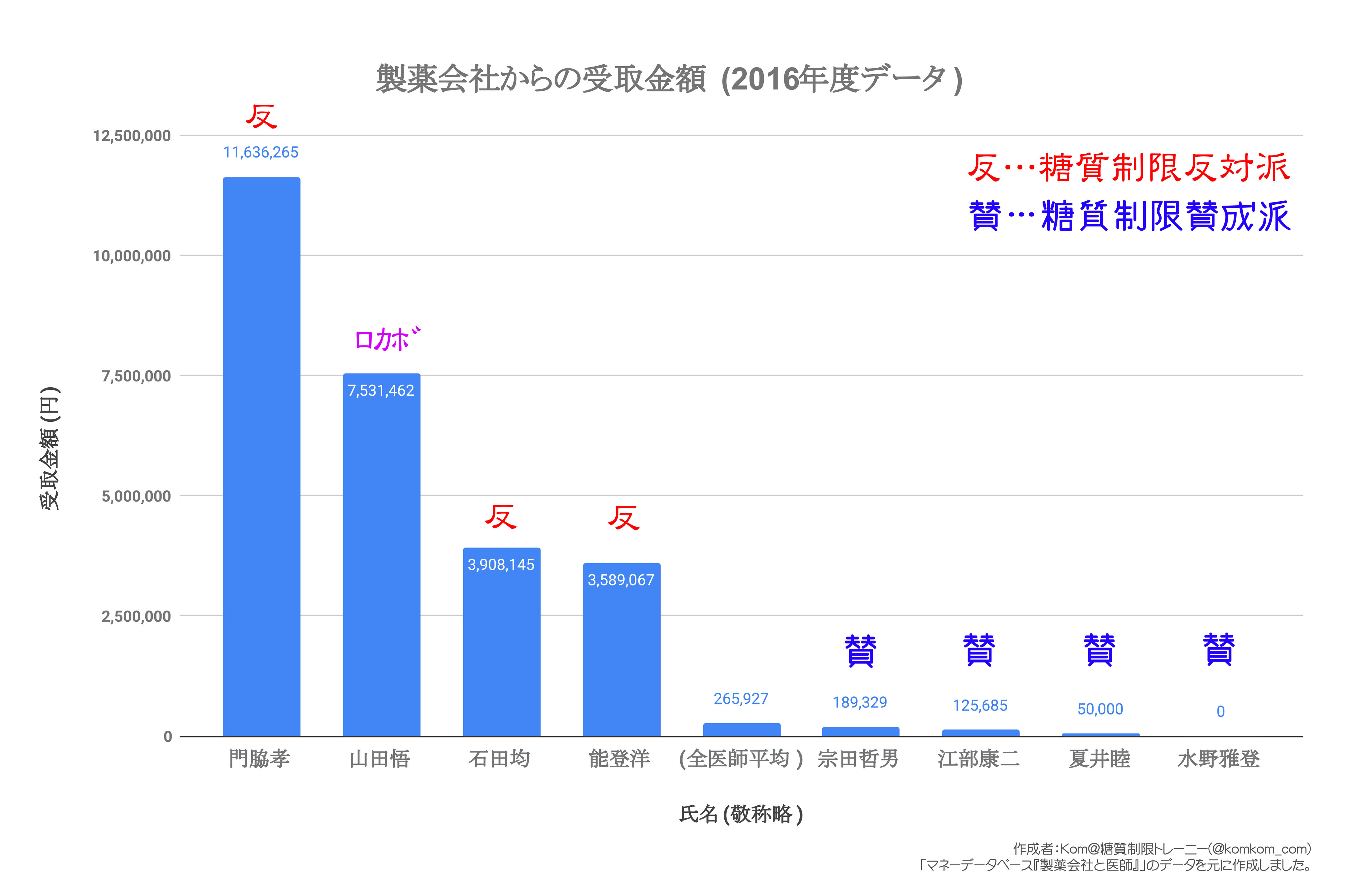 糖質制限賛成派・反対派医師の利益相反について 栄養学 2019年01月26日 「日本糖尿病学会理事長&糖尿病センター長(ロカボ提唱者)が、製薬会社から多額の資金提供を受けている事が判明」という動画をアップしました。 「マネーデータベース『製薬会社と医師』」にて、糖質制限賛成派と反対派の医師を調査した結果、反対派の医師が非常に多くの資金を製薬会社から受け取っている事が分かりました。 本ブログ記事では、動画の内容をダイジェストでご案内します。 つづきはこちら [17回]